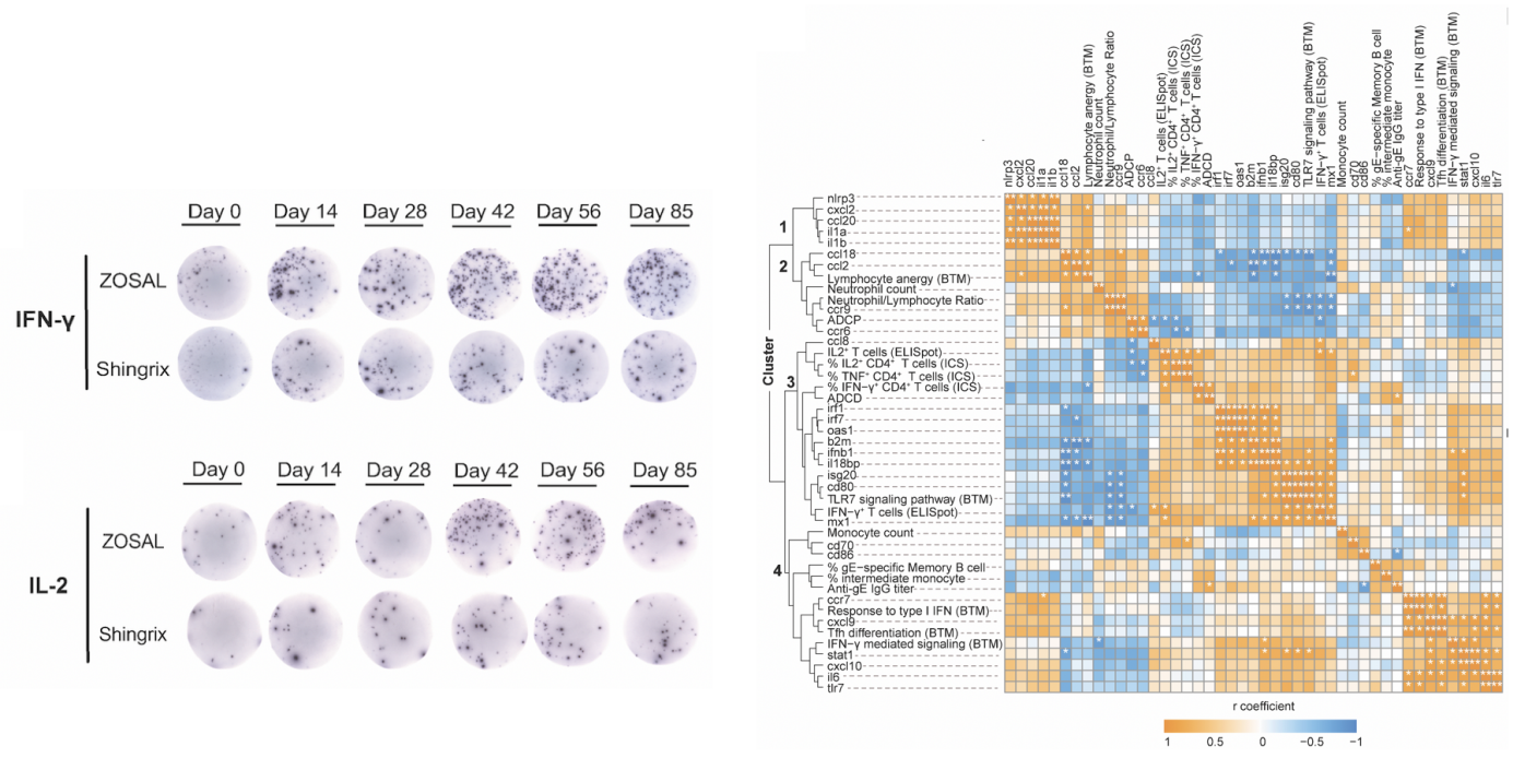 图1. 恒河猴中,带疱mRNA疫苗(ZOSAL)诱导显著强于Shingrix的病毒特异T细胞应答(左图);多变量相关性和聚类分析鉴定疫苗特异性应答相关标志物(右图)