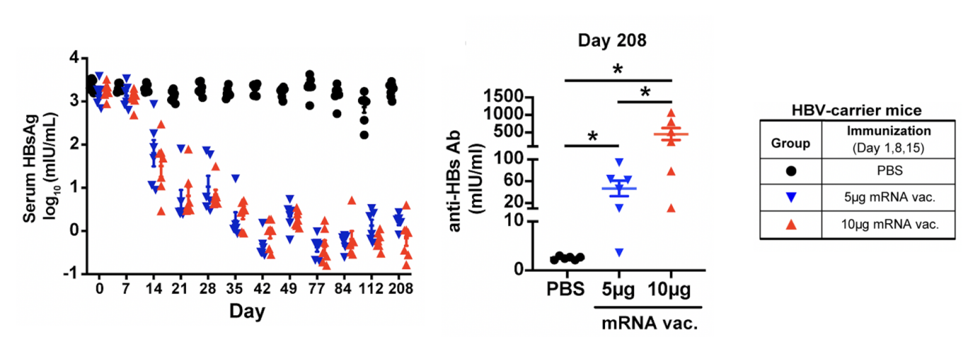 图2. HBV mRNA疫苗三针给药彻底清除HBV小鼠血清HBsAg(左图);免疫后208天,小鼠血清anti-HBs抗体维持高水平(右图)。