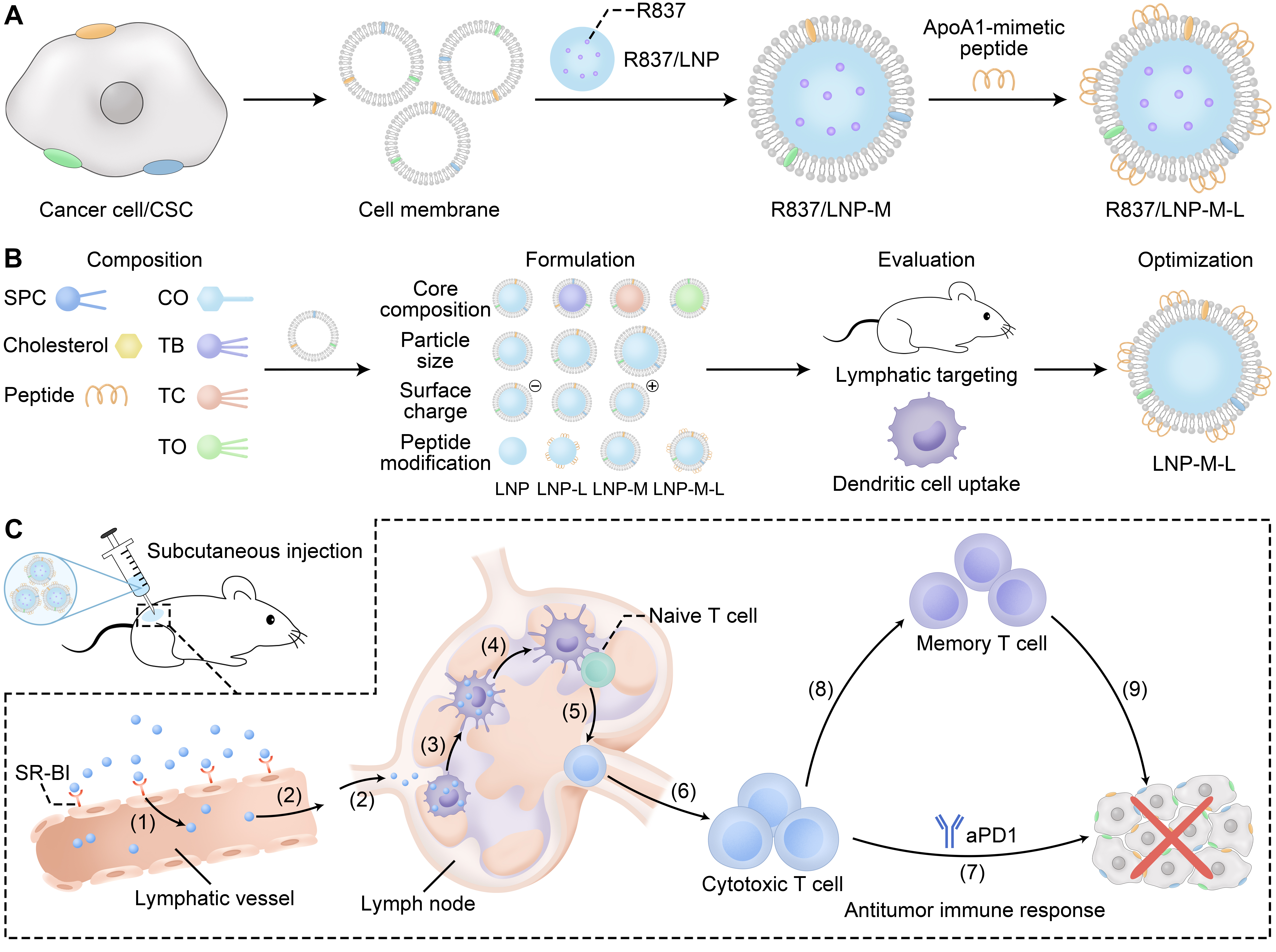肿瘤疫苗通过激活或增强机体的免疫系统来识别、攻击和清除肿瘤细胞,在肿瘤的预防和治疗中发挥着重要作用。然而,与外源性病原体(如病毒或细菌)获得抗原的传统疫苗相比,肿瘤抗原的免疫原性较低,无法有效激活免疫系统产生强大的抗肿瘤免疫发应。并且,传统疫苗主要通过激活体液免疫反应,即B细胞介导的抗体产生,而细胞毒性T淋巴细胞(CTLs)介导的细胞免疫对清除肿瘤细胞更为重要。为此,莫然教授课题组构建了负载免疫佐剂和肿瘤细胞膜的仿生脂蛋白纳米粒的淋巴靶向肿瘤纳米疫苗,通过对组分、粒径、电荷以及表面修饰系统筛选与优化,获得高淋巴靶向和抗原呈递细胞摄取效率的纳米疫苗。该纳米疫苗能够高效富集并滞留于淋巴结,通过树突状细胞等抗原呈递细胞激活T细胞,产生CTLs,并形成长期免疫记忆,有效抑制肿瘤及干性相关耐药肿瘤的形成和生长,并增强免疫检查点抑制剂对干性介导的免疫耐受肿瘤的疗效。该研究为肿瘤纳米疫苗免疫疗法拓展了新思路和新方法。