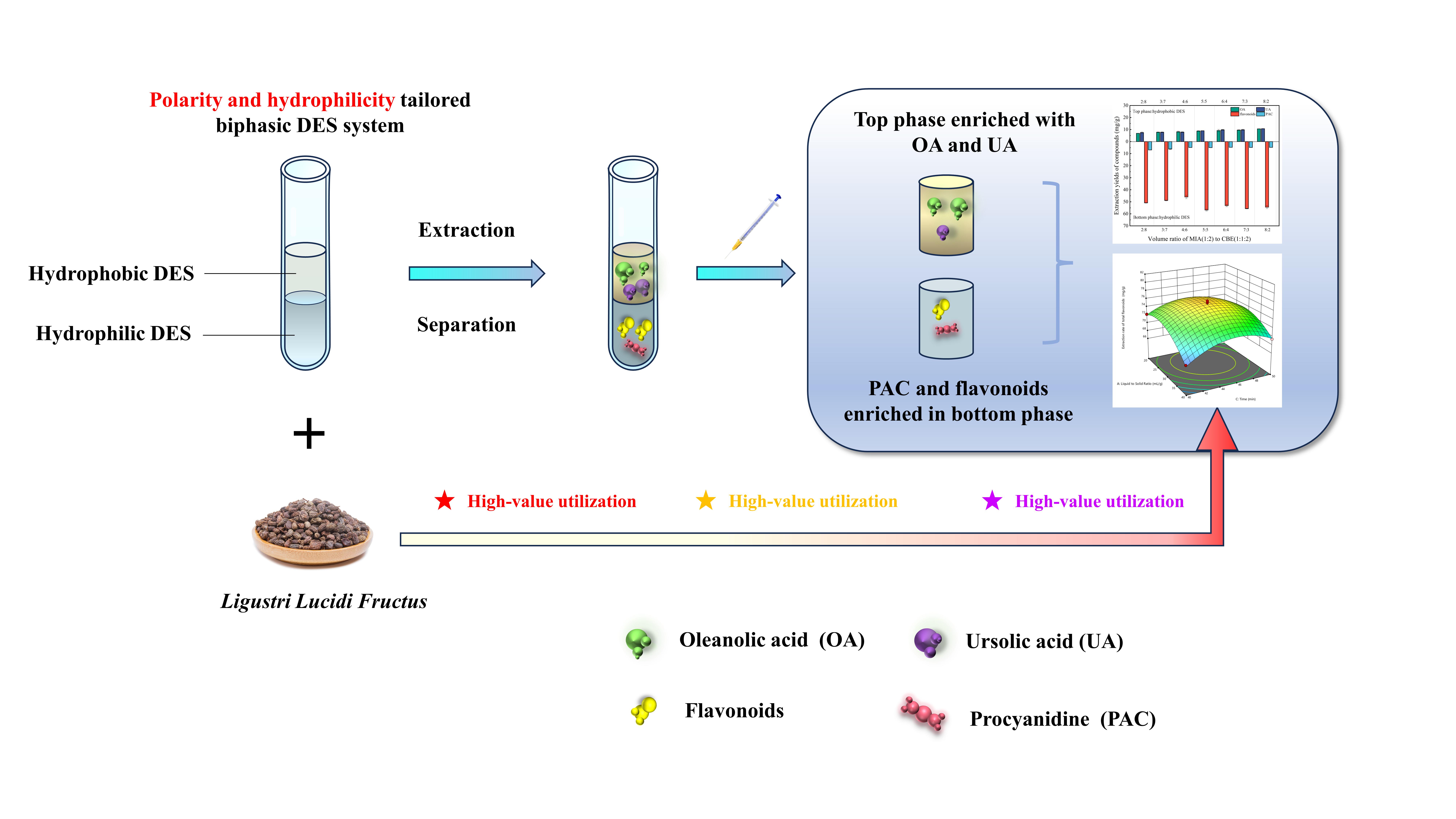 为了攻克上述瓶颈问题,肖得力、Dramou Pierre团队根据低共熔溶剂(DES)的亲疏水性质构建了双相萃取体系。以中药女贞子为研究对象,通过调节双相体系溶剂的极性,建立了以疏水性低共熔溶剂MIA和亲水性低共熔溶剂CBE组成的双相DES体系,实现了在一个步骤中同时提取和分离女贞子中齐墩果酸、熊果酸、黄酮类和原花青素等多种极性不同的活性成分。与传统的单相有机溶剂的萃取系统相比,双相 DES 系统可实现更高的萃取效率并同时分离多种成分。同时,DES具有较好的选择性和生物相容性,并且萃取物显示出更强的抗氧化活性。本研究设计的双相 DES 系统为女贞子的高效利用提供了理论依据,在推进中药提取工艺现代化和工业应用方面具有应用潜力。