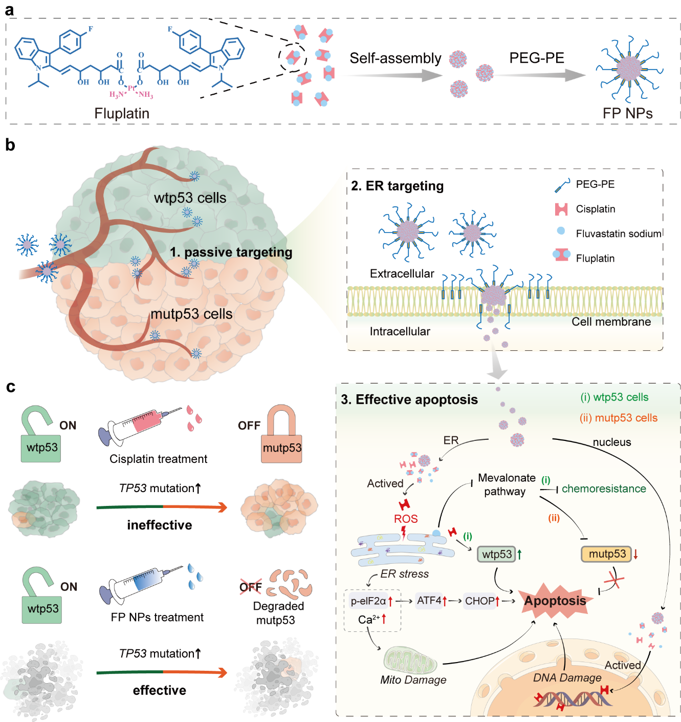 课题组首先验证了肿瘤治疗期间顺铂进行性化疗耐药的一些可能机制,包括伴随着TP53突变风险增加,顺铂耐药性也增加。为解决这一问题,课题组合成了由顺铂与氟伐他汀组成的Fluplatin并构建了最终制剂FP NPs。FP NPs不受p53突变的限制,靶向内质网后降解突变p53,并高效引发内质网应激,从而独立于p53途径发挥了有效的抗肿瘤作用。FP NPs减缓肿瘤进展,并体现出大幅度改善p53突变所带来的不良预后的潜力。