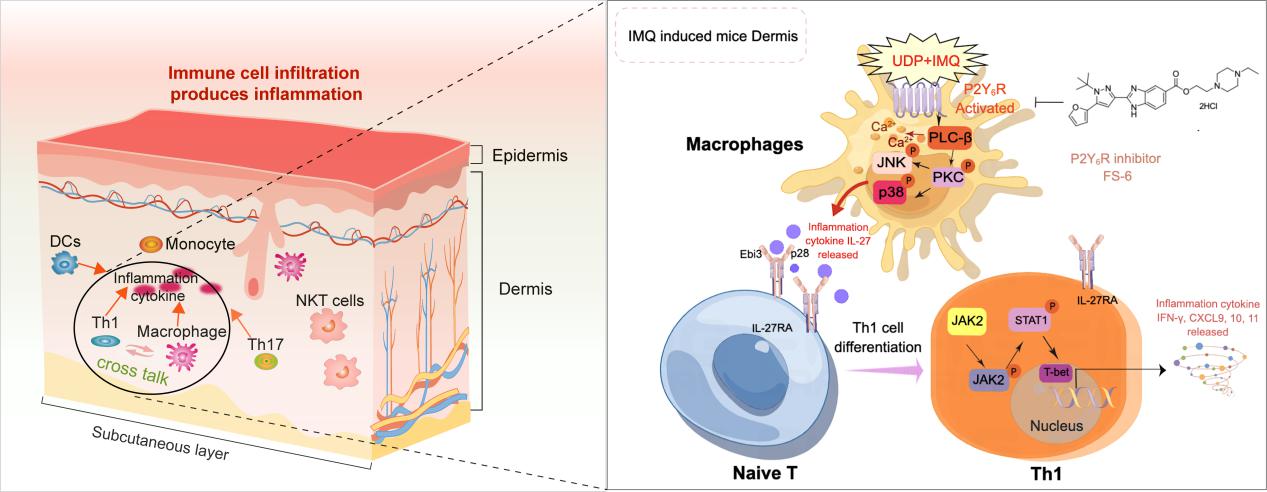 近日,医学学科顶尖期刊Acta Pharmaceutica Sinica B(影响因子IF=14.7)在线发表了beat365药学院胡庆华/周梦泽团队的最新研究成果“Macrophage P2Y6R activation aggravates psoriatic inflammation through IL-27-mediated Th1 responses”。药学院博士尹力为本论文的第一作者,药学院胡庆华教授、周梦泽助理研究员和苏州大学李环球副教授为共同通讯作者,beat365官方网站为第一通讯单位。
