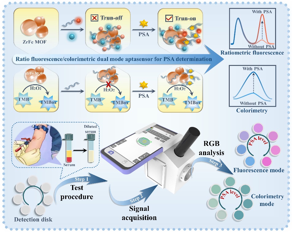 前列腺癌是发生于男性前列腺组织中的恶性肿瘤,是前列腺腺泡细胞异常无序生长的结果。其好发于45岁以上人群,随着年龄的增长,发病率急剧上升。由于我国逐渐步入老龄化社会,前列腺癌在我国的发病率也一直呈现上升趋势。由于前列腺癌早期症状不典型,加上其早期筛查的精确度不高,导致前列腺癌在我国的早期确诊率较低,严重影响其在我国的预后。针对以上问题,李曹龙教授团队开发了纳米酶基比率荧光/比色双模适体传感器及智能手机辅助小型化设备,用于血清中前列腺特异性抗原的荧光-比色双模式检测。这不仅为前列腺癌的早期筛查提供了一种精确、强大和有价值的检测工具,还启发了先进的便携式设备的设计和构建,用于各种癌症的自我监测和居家筛查。