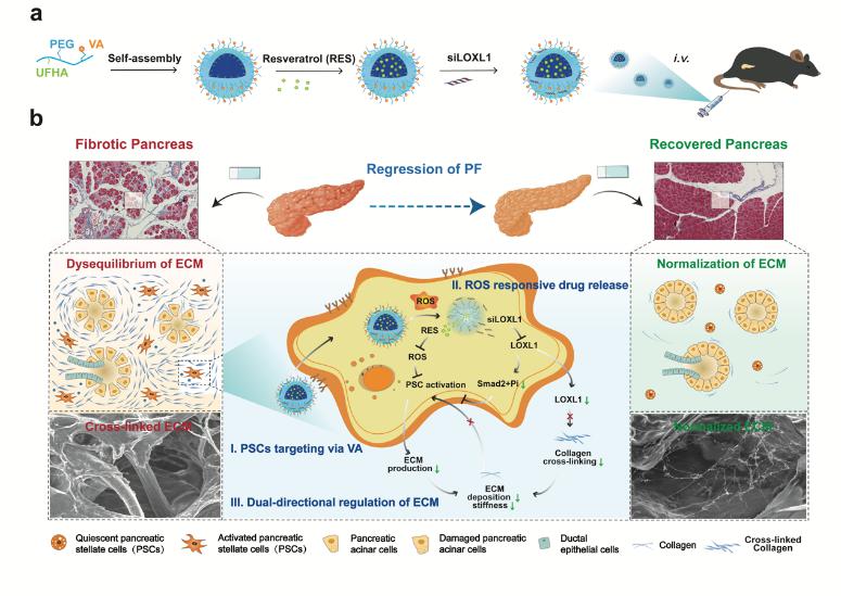 胰腺纤维化主要表现为胰腺星状细胞(PSC)持续激活,引起胶原过度沉积导致的细胞外基质(ECM)稳态失衡。而且过度沉积的胶原会形成病理屏障,严重阻碍药物的有效递送。针对上述问题,姜虎林教授团队前期已设计并制备胶原结合肽和胶原酶I共修饰的双重载药脂质体(命名为AT-CC),用于胰腺纤维化治疗(Biomaterials 2023, 292, 121945)。在此基础上,团队进一步构建PSC靶向调控制剂,清除积聚的ROS,抑制PSC激活,同时抑制胶原交联,促进ECM降解,协同重塑基质与微环境稳态平衡。该研究成果以“Reactive oxygen species-responsive nanoparticles toward extracellular matrix normalization for pancreatic fibrosis regression”为题发表在Advanced Science上,东南大学医学院祁靓博士和beat365官方网站段博文博士生为论文共同第一作者,beat365官方网站药学院姜虎林教授、美国加州大学Stephen J. Pandol教授和东南大学附属中大医院李玲教授为本文共同通讯作者。