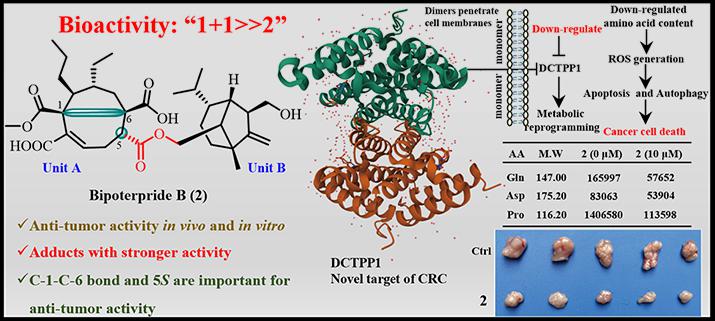 茜草是我国传统常用中药,具有重要药用价值。该团队综合利用OSMAC、代谢组学和分子网络可视化等技术从茜草内生真菌中分离得到系列具有新颖骨架的terpene-nonadride异源二聚体及其单体。其中化合物bipoterpride B具有较好的体内外抗结直肠癌(CRC)活性,优于临床一线抗肿瘤药物5-氟尿嘧啶和顺铂。进一步地,该团队基于DARTS和蛋白质组学技术发现bipoterpride B的潜在作用靶标,并利用生物信息学技术、临床样本等发现DCTPP1是治疗CRC的新靶标,同时证明bipoterpride B能够通过靶向DCTPP1发挥抗结直肠癌活性。上述工作涵盖了中药化学/天然药物化学研究的重要过程,包括化学分析、提取分离、结构鉴定、活性筛选、体内评价及靶标机制等方面研究,丰富了天然产物结构多样性,为结直肠癌提供了新的治疗靶标,同时还发现了首个靶向DCTPP1的抗结直肠癌天然抑制剂,为抗肿瘤药物研究提供了潜在的候选分子。