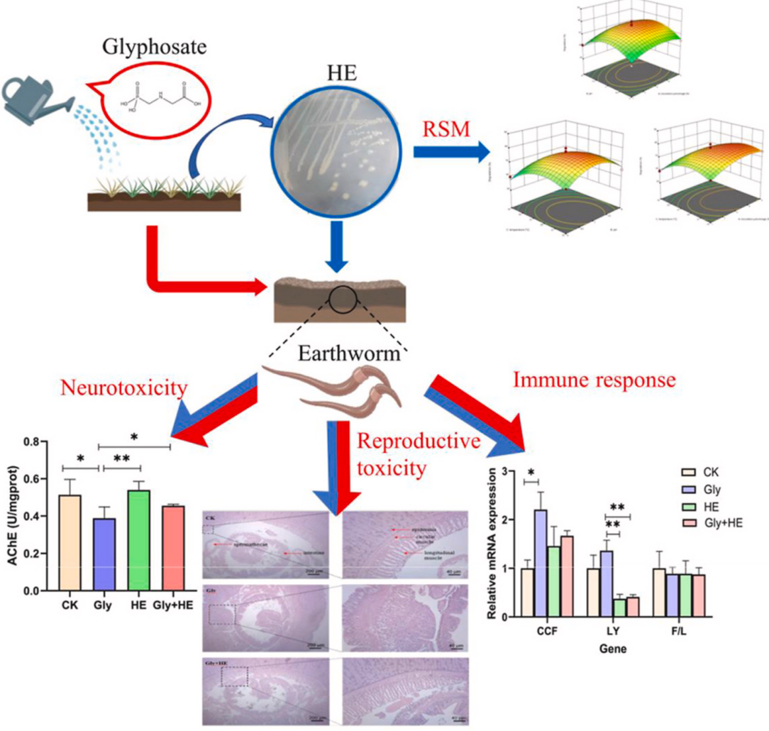 随着现代农业中广泛使用草甘膦(一种广谱除草剂),其对环境尤其是土壤生态系统的影响日益受到关注。本研究从土壤中分离出能够降解草甘膦的细菌——假单胞菌属的HE菌株(Pseudomonas putida HE)。 研究进一步评估了HE菌株对草甘膦诱导的蚯蚓神经毒性和生殖毒性的缓解作用。结果显示,草甘膦显著降低了与神经毒性相关的酶——乙酰胆碱酯酶(AChE)的活性,并影响了蚯蚓的生殖系统结构,草甘膦还激活了蚯蚓的免疫系统,增加了免疫相关基因的表达。HE菌株的引入显著减轻了这些由草甘膦引起的毒性效应,提高了因草甘膦而降低的土壤酶活性。本研究不仅为草甘膦的环境风险管理提供了新的生物技术解决方案,而且展示了在实际生态系统中应用的潜力。HE菌株的高效性和成本效益,使其成为自然环境中草甘膦降解和毒性减少的有效手段,对于保护土壤生态健康具有重要的实践意义。