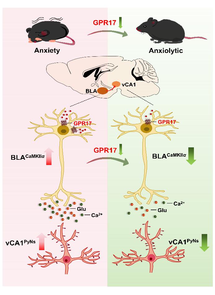 G蛋白偶联受体17(GPR17)是2006年发现的孤儿受体,在中枢神经系统表达水平较高。但是GPR17在不同脑区和不同类型神经元中的分布和功能以及在精神疾病中的作用知之甚少。本研究发现,GPR17在慢性束缚应激诱导的焦虑模型小鼠基底外侧杏仁核(BLA)谷氨酸能神经元中的表达水平显著增加。敲减BLA谷氨酸能神经元中GPR17能显著改善小鼠焦虑样行为;过表达BLA谷氨酸能神经元中GPR17能显著增加小鼠对应激的易感性。进一步研究发现,GPR17通过调控BLA脑区谷氨酸能神经元兴奋性,影响BLA至腹侧海马CA1亚区谷氨酸能神经冲动传递,从而调节小鼠焦虑样行为,这一发现为确立GPR17作为抗焦虑药物作用靶点奠定了基础。