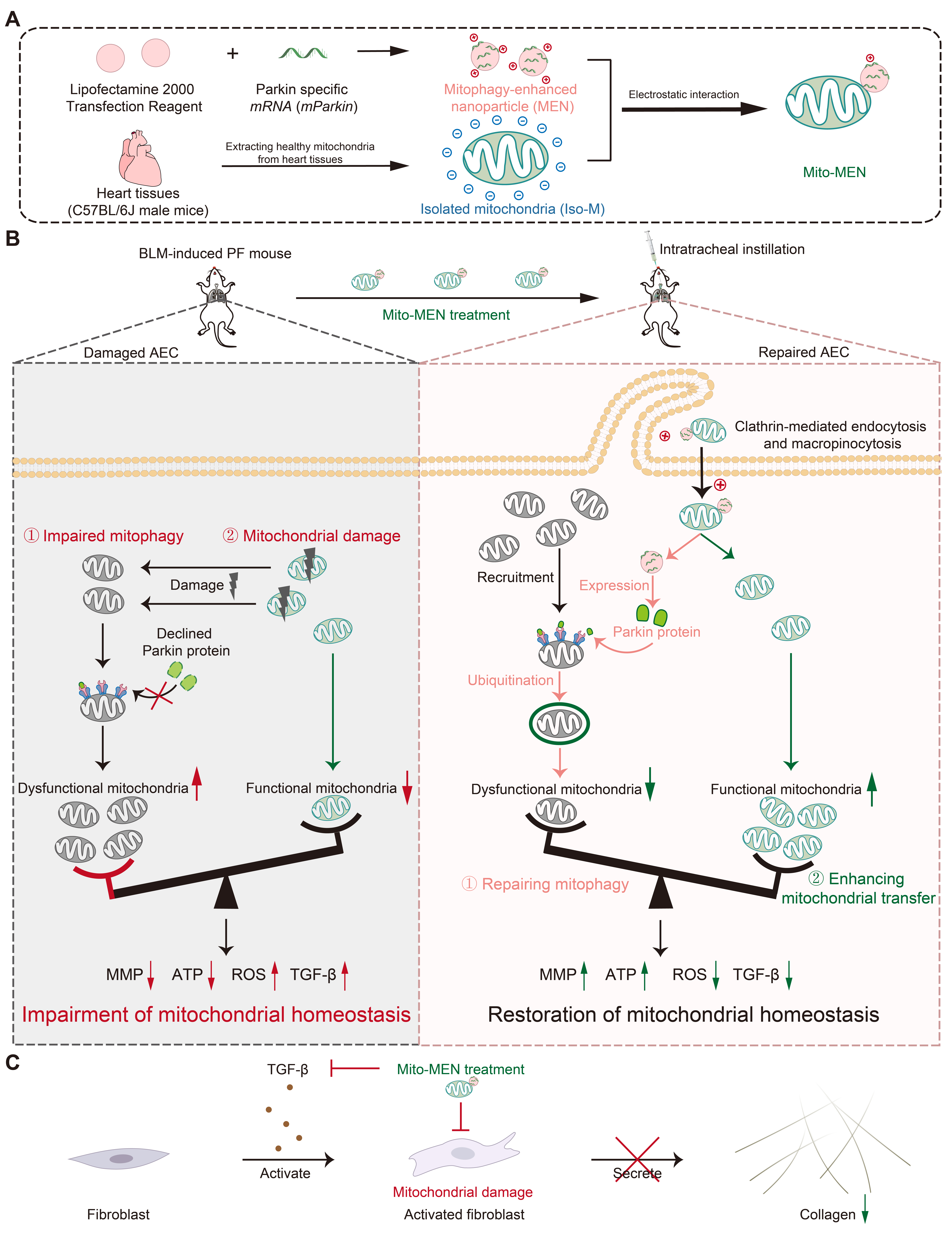 肺纤维化(Pulmonary fibrosis,PF)是一种进行性且致命的间质性肺部疾病,与肺泡上皮细胞线粒体稳态失衡密切相关,该疾病也是典型的继发性线粒体疾病。线粒体移植可通过递送外源性线粒体恢复线粒体功能。然而在PF病理状态下,由于线粒体自噬受损,功能障碍的线粒体无法得到有效清除,这影响了线粒体稳态调控的效果。该研究团队构建了一种线粒体自噬增强型纳米粒修饰的工程化线粒体,一方面通过提高线粒体递送效率增加细胞内健康线粒体的比例;另一方面通过促进功能失调线粒体自噬降解降低受损线粒体的比例,共同调节线粒体稳态。在博来霉素诱导的PF小鼠模型中,工程化线粒体有效修复线粒体功能,并缓解PF症状。相关工作以“Mitophagy-enhanced nanoparticle-engineered mitochondria restore homeostasis of mitochondrial pool for alleviating pulmonary fibrosis”为题发表在ACS Nano上。药学院副研究员王译、硕士毕业生胡力凡、博士生刘娜辉为共同第一作者,beat365姜虎林教授和东南大学医学院中大医院李玲教授为本文共同通讯作者。