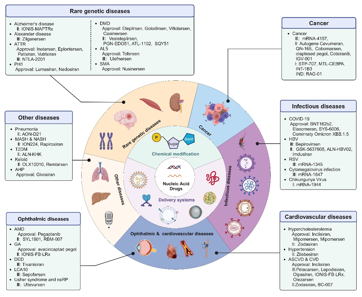 核酸药物的临床应用。多种核酸药物被用于治疗罕见遗传病、癌症、眼科疾病、心血管疾病和感染性疾病等,并展现出显著的治疗效果。