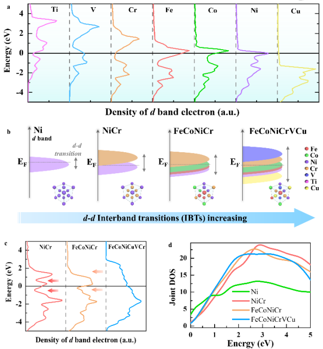 光热转换材料是把吸收的光能转变为热能的一类材料,在光热治疗,太阳能利用等诸多领域起着至关重要的作用。基于局域等激元共振效应,金属纳米颗粒,比如Au,Ag等,是最受关注的光热转换材料,但是由于等离激元共振范围有限,难以赋予材料在紫外到红外的波段内都具有优异的光吸收性能,而且价格昂贵,在太阳能光热利用方面存在很大的局限。徐波副教授根据带间跃迁机制可以发生在很宽的光谱范围内,并基于d电子非常局域的特点,首次提出如果能够在材料费米能级上下4 eV区间内都填充上合适的3d电子,该材料将会具有在很宽的波段范围内具有优异的光吸收性能。通过理论计算发现,3d过渡金属高熵合金是符合这一要求的完美材料体系。徐波副教授和东北大学/杭州电子科技大学张雪峰教授实验团队合作,成功制备了多组元3d 过渡金属高熵合金纳米颗粒,验证了其在200 ~2500 nm范围内优异的光吸收性能,并且把该材料应用于太阳能水蒸发,发现基于该机制的水的蒸发速率要高于其他材料的实验报道。此工作为设计新型,能够在很宽波段范围内都具有优异光吸收性能的光热材料提供了新的思路。