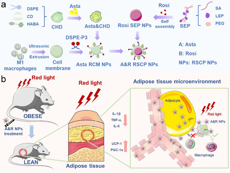 为此,刘畅教授课题组设计了一种新型的红光响应型仿生纳米递药系统—RSCP NPs。该系统通过脂肪靶向肽修饰生物膜仿生载体,精准靶向白色脂肪组织炎症区域,并利用红光/pH双响应系统实现药物精准时空控释。研究结果表明,RSCP NPs能将虾青素和罗格列酮递送至M1型巨噬细胞和白色脂肪细胞,缓解白色脂肪组织低度炎症并促进棕色化,并通过组学分析揭示了“代谢—免疫双向协同调控”的关键节点。该研究为新型药物递送系统在代谢性疾病中的开发和应用提供了理论依据和实践基础。