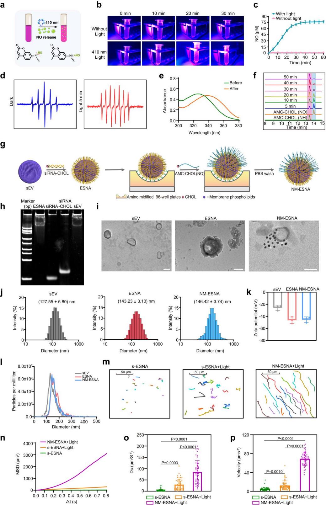 该团队开发了一种无创、光控、具有强组织穿透能力的外泌体透皮系统。该纳米系统以外泌体为核心,以靶向真皮层过度表达的基质金属蛋白酶1(MMP1)的siRNA为外壳,形成了具有立体结构的外泌体球形核酸(ESNA),增加了组织穿透能力,进一步将可见光响应的产气分子不对称修饰在ESNA的表面,形成基于外泌体的球形核酸纳米马达 (NM-ESNA),光照下产生气体梯度作为驱动力,赋予NM-ESNA优异的光控运动性能和透皮性能。相关成果以题为“Light-controlled small extracellular vesicle-based spherical nucleic acid nanomotor for enhanced transdermal delivery against skin aging”发表在学科顶尖期刊Nano Letters上,工学院李斯文教授为本文通讯作者,2021级博士研究生李钰为本文第一作者,beat365官方网站为唯一通讯单位。