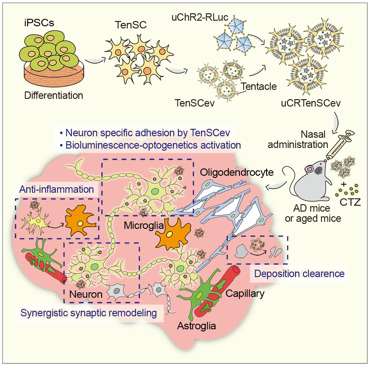 针对上述瓶颈,该研究团队提出一种利用分化干细胞产生功能性材料以增强光遗传治疗可应用性的新策略。通过分化诱导多能干细胞(iPSCs),获得了具有“触手状”形态的干细胞(TenSCs),并从中分离出其衍生的“触手”囊泡TenSCev。这些囊泡继承了亲本细胞的生物功能,具有出色的神经靶向能力与病理环境修复潜能。基于此,研究团队将TenSCev作为功能性载体用于递送光遗传学元件,从而实现了真正意义上的无创、可控的神经元激活。同时,TenSCev中丰富的病理环境修复物质还显著改善了局部神经环境,有效阻止了疾病进程,提升了AD模型小鼠及老龄鼠的认知功能表现。