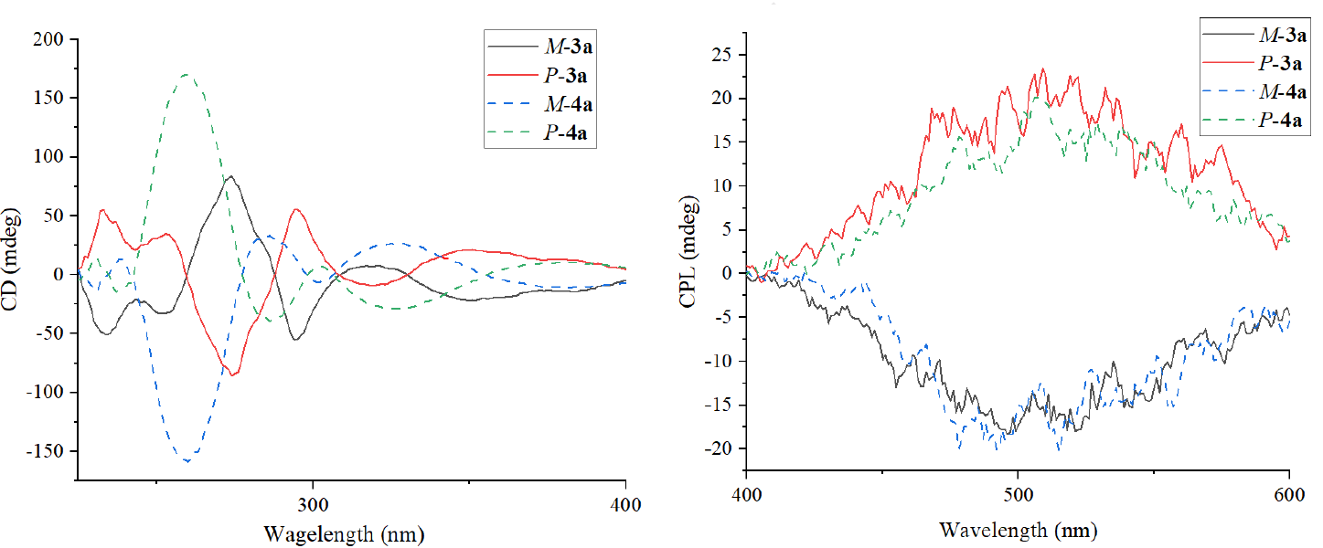 为解决上述难题,团队在前期工作基础上(Angew Chem Int Ed,2022,61, e202212005;Chem Sci, 2025, 16, 7876),利用氮杂环卡宾有机小分子催化的不对称(3+3)环化策略从头构建了吡喃-2-酮稠合[5]螺烯和[4]螺烯类化合物(Figure 1)。消旋化实验表明该类氧杂螺烯骨架具有很高的构型稳定性,易于实现后期官能团化和修饰。所合成的光学纯吡喃-2-酮稠合螺烯分子具有良好的光学物理性质和手性光学性质(Figure 2),在材料化学等领域具有潜在的应用价值。该方法不仅为不对称合成具有潜在应用价值的氧杂螺烯骨架提供了全新策略,也为有机催化不对称合成杂螺烯分子提供了新思路。