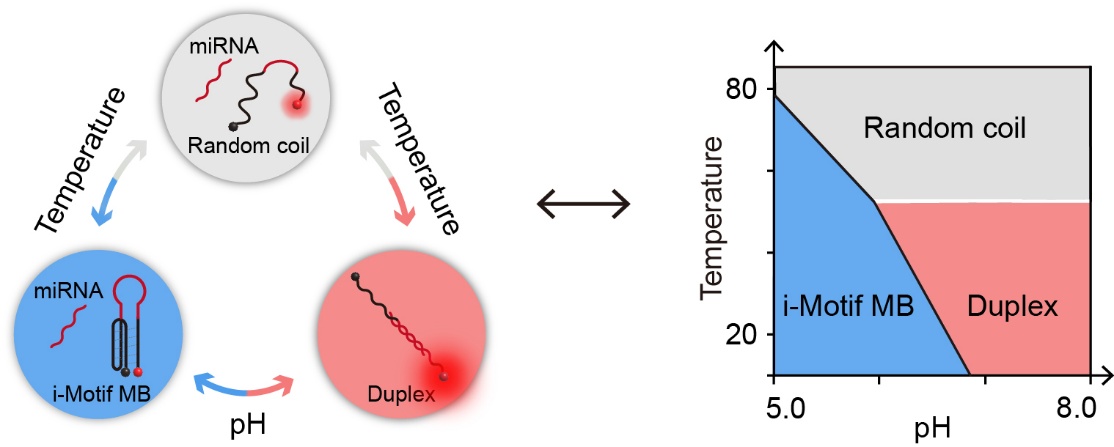 近日该课题组报道了首例基于i-motif DNA结构的分子信标(iMB),并成功将其应用于癌症标志物microRNA(miRNA)的检测。在本研究所设计的iMB结构中,i-motif作为分子信标茎区域,既是结构框架又是pH传感器,其三个环区域单链则作为识别单元直接参与目标miRNA的结合。为了解决环境pH和温度同时影响iMB结构稳定性的问题,该研究利用核酸相图分析法来优化和阐明靶标miRNA和iMB之间的动态结合平衡,实现了核酸的高灵敏和特异性检测。此外,研究发现iMB对核酸酶具有降解抗性,利用这种性质设计了一种等温信号扩增技术,进一步提高检测灵敏度。最后,将iMB应用于模型细胞和癌症血液样本的miRNA检测,结果显示其与经典的RT-qPCR检测性能接近。