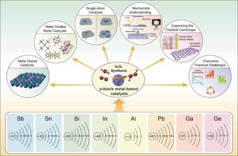 本研究中,作者通过对数百篇文献的计量分析,揭示了过去十年p区金属研究的显著增长趋势,详细探讨了p区金属基催化剂的合成与优化策略。基于文献中密度泛函理论计算的综合分析,总结了其2e⁻途径的催化反应机制。最后,综述梳理了该领域的主要挑战与未来方向。这项工作不仅为p区金属基催化剂设计提供了新视角,也将推动可持续过氧化氢电合成技术的发展。