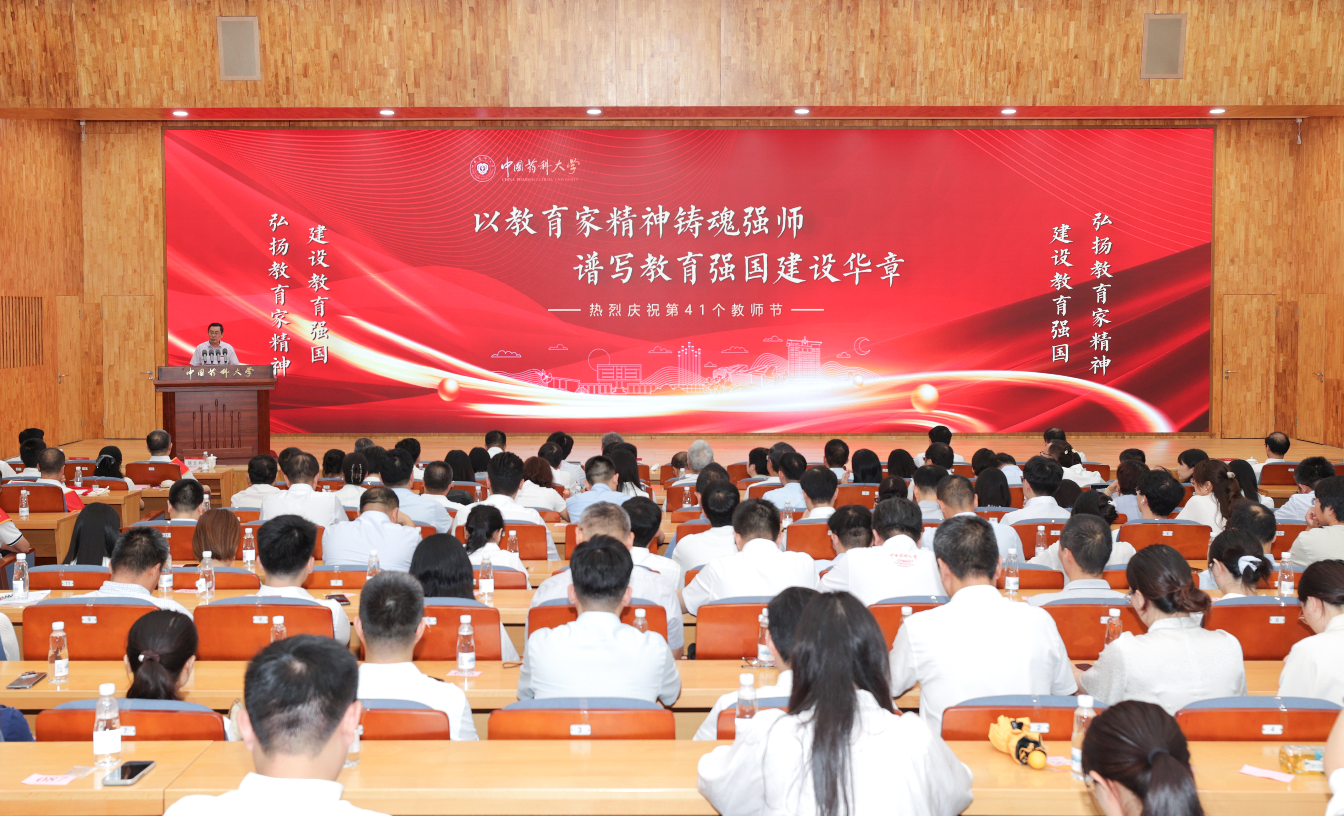 大会在庄严的国歌声中拉开序幕。戴建君代表学校向全体教职员工致以节日问候,向为学校建设与发展作出贡献的广大教师表示衷心感谢。他强调,近年来全校上下深入学习贯彻习近平总书记关于教育的重要论述和全国教育大会精神,努力改善办学条件,优化教书育人环境,充分发挥教师潜力,提高教师待遇,关心教师健康,维护教师权益,全力营造尊师重教的良好氛围。他指出,在全体教职工的共同努力下,学校在学科建设、教育教学、师资培引、科学研究、社会服务等方面实现新突破。他向全校教师提出三点希望:一是做“信仰领航、德行垂范”的药学人才铸魂者,牢记“为党育人、为国育才”的初心使命;二是做“教书育人、授业解惑”的药学知识赋能者,以前瞻视野培养学生的创新意识与社会责任感;三是做“创新引领、守护健康”的药学使命践行者,助力我国生物医药领域高水平科技自立自强。
