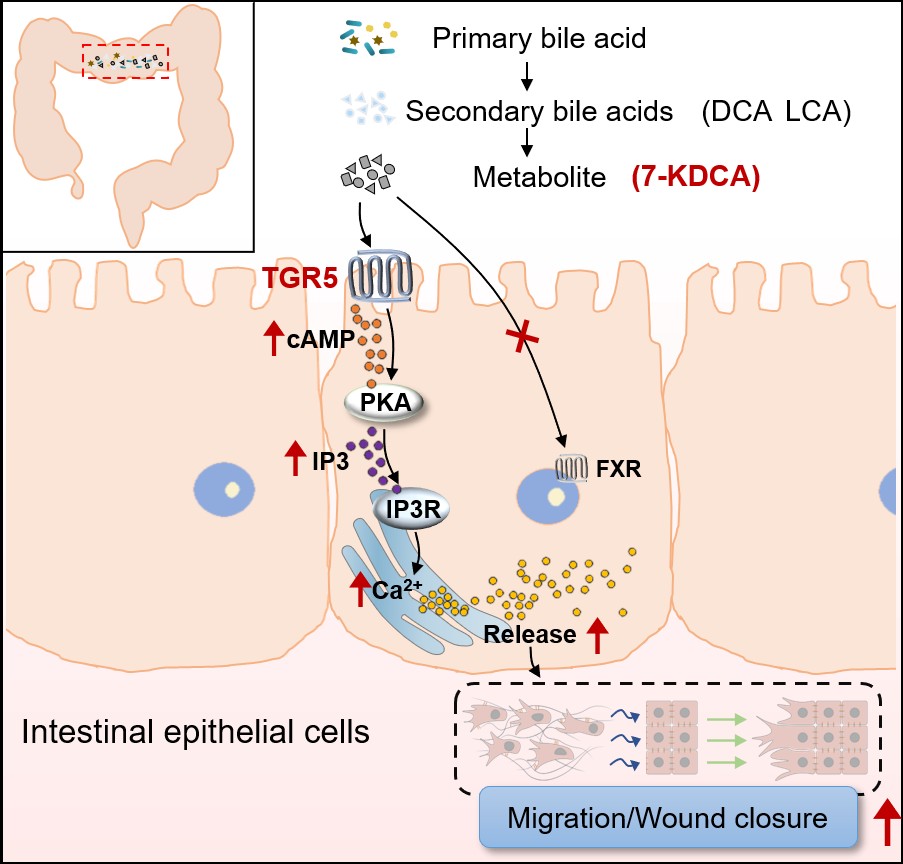 研究团队通过系统筛选发现,UC患者与结肠炎模型小鼠血清中多种胆汁酸水平显著降低,以7-酮脱氧胆酸(7-KDCA)的下调最为显著,且其含量与疾病严重程度呈负相关。在多种胆汁酸中,7-KDCA表现出最强的促黏膜修复作用,而外源性补充7-KDCA可显著加速DSS诱导与活检所致肠损伤模型小鼠的结肠黏膜愈合。机制研究表明,7-KDCA并非通过传统的抗炎免疫途径发挥作用,而是直接作用于肠上皮细胞,通过激活TGR5-IP3R信号轴,诱导内质网钙释放,从而增强上皮细胞的迁移能力,驱动伤口闭合,该发现为黏膜修复治疗提供了新靶点与理论依据。中药学院博士研究生章静为本论文的第一作者,戴岳教授和夏玉凤教授为共同通讯作者。