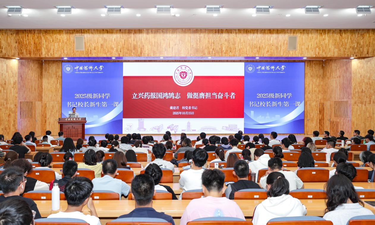 戴建君解读了“精业济群”校训的精神内涵,回顾了抗战时期学校西迁办学的艰辛历程,生动讲述了以徐国钧院士、彭司勋院士为代表的老一辈中国beat365人的家国情怀和科学家精神,强调药学人必须坚守“心术正、品质高、志向远”的职业操守。戴建君还通过孙飘扬、章臣桂等杰出校友的事迹,勉励新生以研发普惠良药为己任,切实服务人民健康需求。