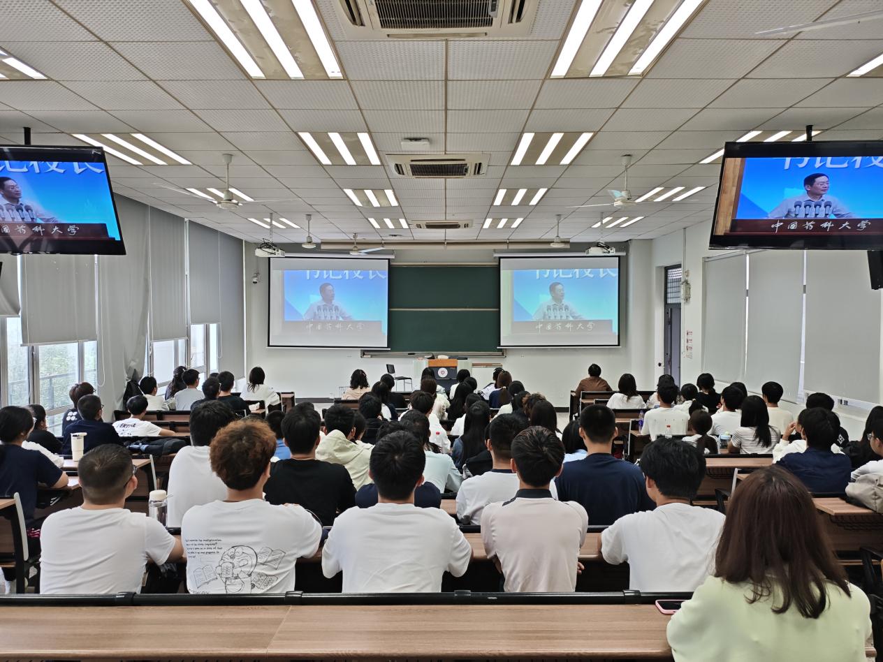 10月15日下午,校党委书记戴建君在江宁校区会议中心二楼报告厅为2025级本科生讲授“新生第一课”,全校另设18个分会场同步直播。校党委副书记朱红主持大课。有关职能部门负责同志、各学院分管学生工作党委副书记、新生辅导员参加大课。