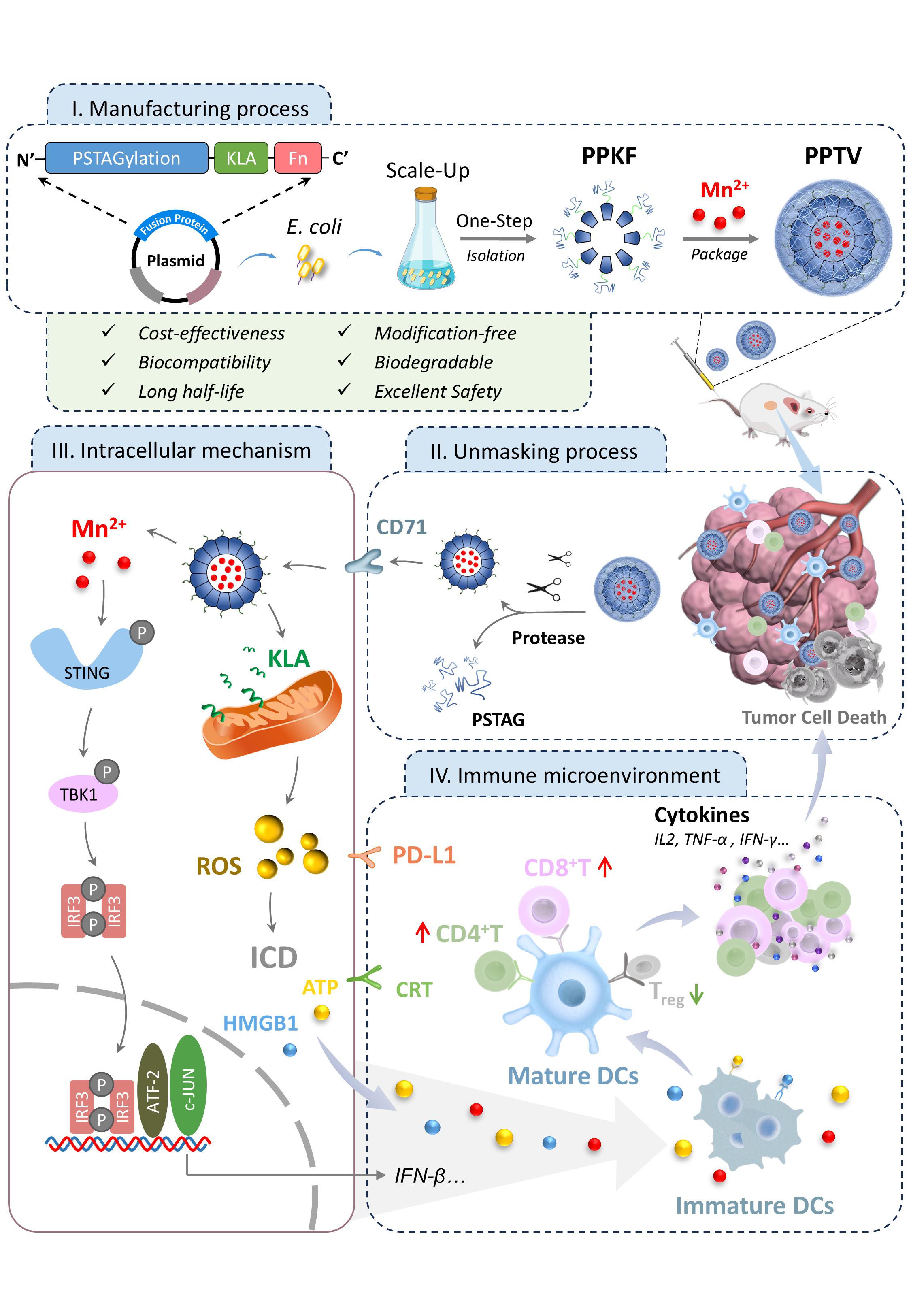靶向释放”前药策略,构建了一个全蛋白质工程化改造的前药化疫苗系统Protease-activated PSTAGylated in situ Tumor Vaccine(PPTV)。该系统以人源重链铁蛋白为框架,通过基因工程方法在其外表面融合筛选获得的线粒体损伤肽以诱导免疫原性细胞死亡(ICD),并在内部封装金属离子以激活cGAS-STING信号。使用柔性的PSTAG屏蔽肽和肿瘤微环境高表达蛋白酶的酶切序列构建工程化蛋白前药,使其在循环中保持“隐身”状态,而在肿瘤微环境中被蛋白酶选择性“解封”,恢复受体介导摄取与免疫活性。