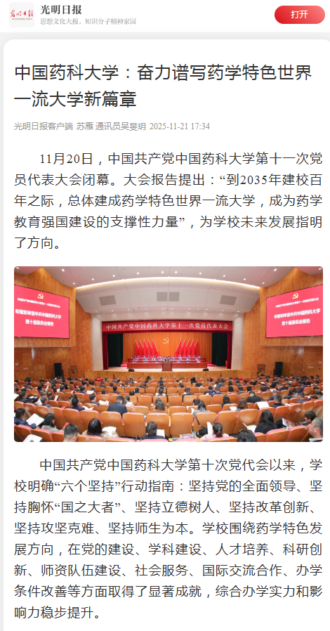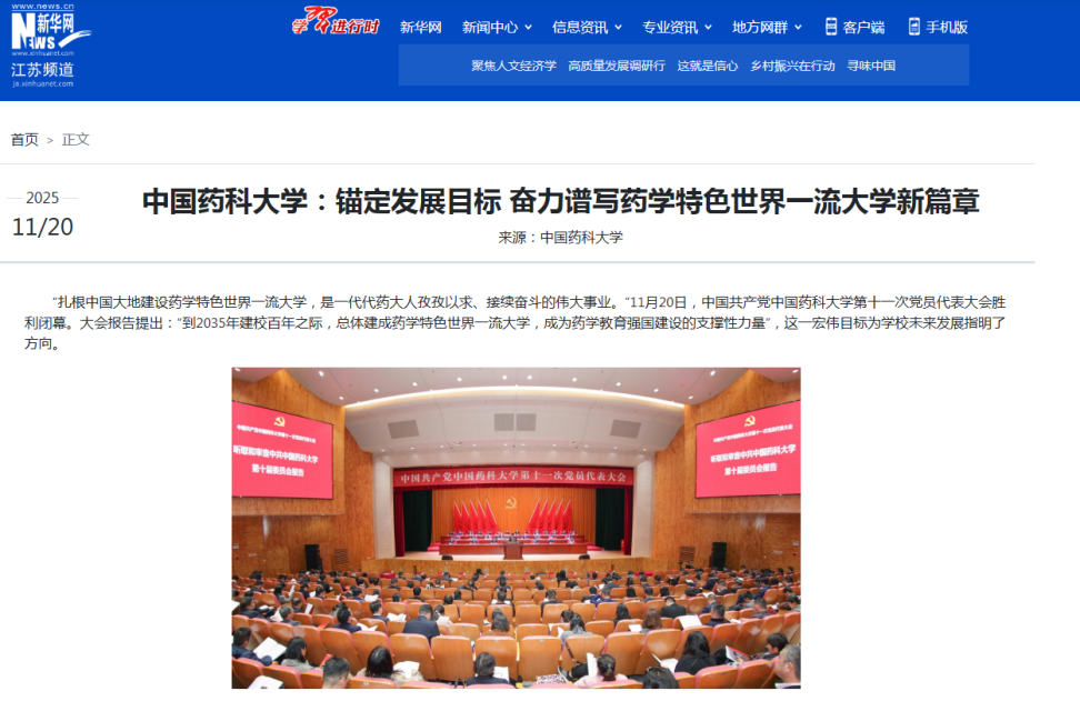 11月20日,中国共产党beat365官方网站第十一次党员代表大会胜利闭幕。大会全面总结了第十次党代会以来学校改革发展进程中取得的工作成就、积累的宝贵经验,科学分析了学校当前面临的机遇与挑战,科学谋划了未来发展蓝图。会议期间,学校奋力谱写药学特色世界一流大学新篇章的创新实践获得新华社、光明日报等中央主流媒体的广泛关注。
