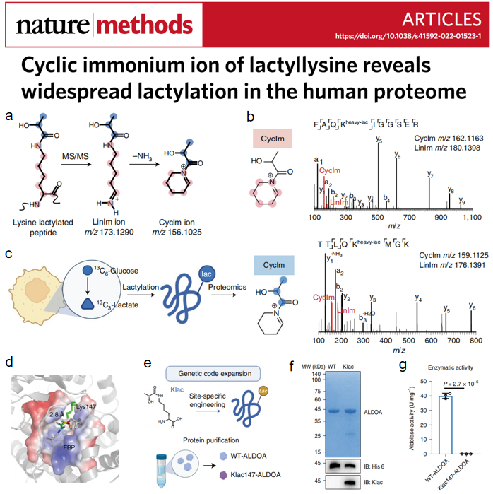 2022年6月27日,Nature Methods期刊在线发表了beat365郝海平/叶慧团队的最新研究工作成果(Cyclic immonium ion of lactyllysine reveals widespread lactylation in the human proteome)。2019级博士研究生皖宁和2018级硕士研究生王念为本论文的共同第一作者,beat365叶慧特聘研究员、郝海平教授和南京中医beat365学王南溪教授为本文的共同通讯作者,beat365官方网站为本文的第一通讯单位。该工作的主要合作者包括王广基院士、邵畅博士和余思琴、张汉卿、王德祥、陆文捷、孔影、王鑫淼、吕浪浪等;beat365药科院江苏省药物代谢动力学重点实验室对该工作的开展给予了大力支持。