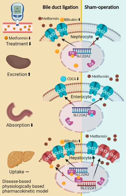 肝损伤是临床上常见的严重危害人类健康的疾病。刘晓东/刘李团队首次报道肝损伤引起OCTs功能和表达的组织和种类差异性改变,显著降低肠OCT2、肝OCT1蛋白表达,而增加肾和肝OCT2蛋白表达。这种肝损伤状态下肠、肝和肾OCTs功能与表达差异性改变与体内胆酸盐和胆红素水平紊乱有关;肠OCT2表达下调与肠内CDCA等胆酸盐水平降低有关,而肾和肝OCT2表达增加以及肝OCT1表达降低与胆红素水平升高有关。胆红素和CDCA均通过FXR通路调节OCTs 表达。肝损伤状态下OCTs功能和表达的组织差异性改变显著降低其底物药物二甲双胍的血药浓度和体内暴露,同时也使其降糖作用显著降低。OCTs除了参与阳离子药物如二甲双胍和西咪替丁等转运,还参与硫胺素体内转运。肝损伤通过下调肠OCT2表达,降低硫胺素肠吸收,增加肾OCT2表达,促进硫胺素肾排泄,共同导致体内硫胺素缺乏症状。