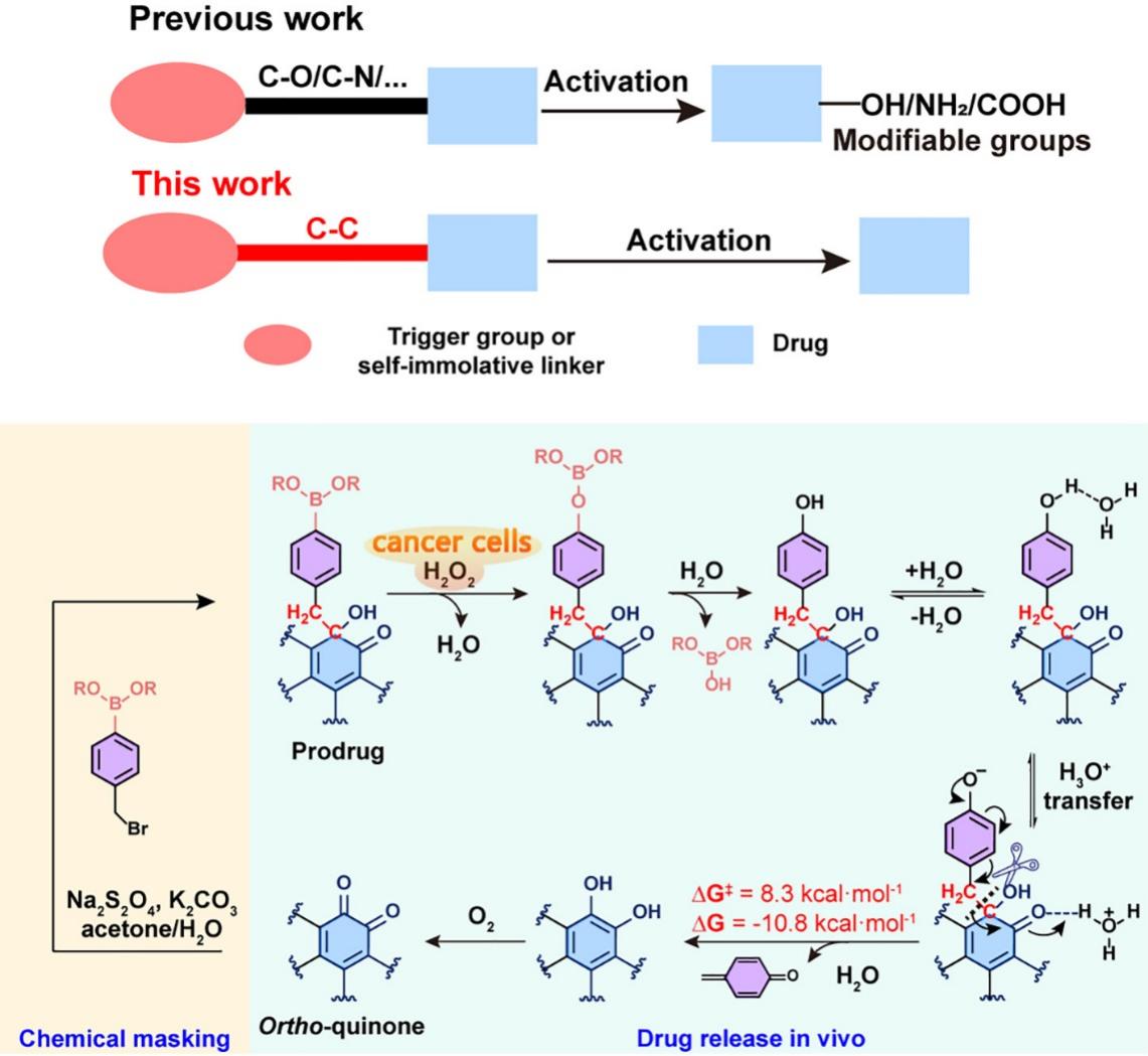 本研究发展了一种基于“C-C键”断裂的前药设计策略:通过“C-C键”化学修饰来稳定屏蔽“邻醌”活性基团,设计合成获得α-羟基酮结构的前药分子;该前药分子还含有苯硼酸结构的ROS响应基团,可在肿瘤组织高水平ROS触发下,通过基于1,6-消除的“C-C键”断裂及快速氧化级联过程,选择性在肿瘤组织中释放邻醌类抗肿瘤药物。密度泛函理论(DFT)计算表明,关键的C-C键断裂释药步骤的活化能仅为8.3 kcal/mol,可在生理条件下快速释药,其驱动力可能源自产物的芳构化效应。作者将该前药策略应用于多个邻醌类抗肿瘤天然产物,代表性的β-lap前药分子具有良好体内抗胰腺癌药效,且在810 mg/kg剂量下对正常组织无明显毒副作用,安全性显著优于原药(LD50 = 115.8 mg/kg)。该研究发展的基于C-C键断裂的前药策略,为邻醌类药物的前药设计、改善安全性等提供了新方法与新思路。
