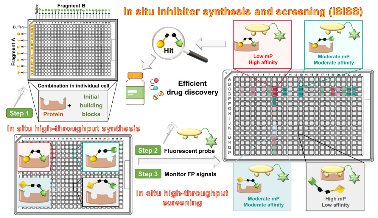 药物先导物的发现往往是药物早期研发的限速步骤之一,经典的先导物发现须经历“设计-合成-分离纯化-靶标活性评价”的循环优化的过程,研究周期较长。鉴于此,张晓进教授团队创新提出了基于荧光偏振(FP)检测技术的高通量靶标原位抑制剂合成与筛选(ISISS)的药物发现策略。ISISS方法包含三个步骤:1)于384孔板中加入靶标蛋白、缓冲液及合成片段;2)利用“生物正交反应”在蛋白原位高通量快速完成抑制剂合成;3)加入荧光探针,利用酶标仪检测FP信号值,即可高通量获得每个组合化合物对靶标的结合活性数据。ISISS方法集 “靶标原位抑制剂的高通量合成、高通量活性筛选”为一体,极大地提高了创新药物发现与优化效率。