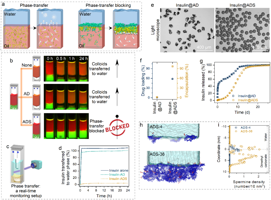 近日,刘东飞教授团队进一步研究发现,具有界面活性的两亲性聚合物材料在油水界面处形成致密界面膜,阻塞具有较大空间位阻的药物胶体颗粒与油水界面接触,抑制药物胶体颗粒跨界面扩散,实现药物高包封率(>95%)前提下的高载药量(可达58.3 wt%)微球制备。该研究聚焦药物胶体颗粒和聚合物界面膜的相互作用,结合实验和分子动力学模拟等手段,系统考察了聚合物分子结构对界面膜结构及性质的影响;利用自主开发的药物跨界面扩散实时定量监测装置(专利号CN202221539288.6),明确了界面膜结构对胶体颗粒跨界面扩散的影响;初步形成分子(药物和聚合物分子)、介观(药物胶体颗粒和聚合物界面膜)和宏观(高性能载药微球)三种水平研究的有效互动,从分子水平研究阐明界面膜阻塞药物胶体跨界面扩散的作用机制。所制备高载药微球将胰岛素的体内平均滞留时间从3.1±0.2 h延长至4.6±0.9 d,辅料用量降低1889倍,在减少给药频次、降低注射部位炎症反应方面具有突出优势。本研究有效完善了高性能载药微球核心技术体系,为微粒制剂连续流生产关键设备开发提供指导。