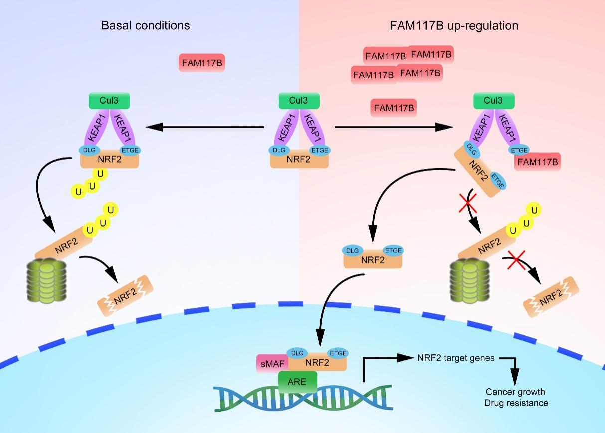 在本研究中,研究者们发现FAM117B能够促进胃癌细胞的生长,同时能够降低细胞对化疗药物的敏感性。分子机制上,FAM117B能够与NRF2竞争性结合KEAP1,减少NRF2的泛素化降解,随后激活KEAP1/NRF2信号通路。此外,FAM117B诱导胃癌细胞的生长和化疗耐受的产生依赖于调控KEAP1/NRF2信号。研究者们还发现FAM117B和NRF2蛋白在胃癌患者肿瘤组织中高表达,并且它们的高表达与患者的不良预后密切相关。综上所述,该研究表明FAM117B在促进胃癌细胞生长和化疗耐受产生的过程中发挥着关键作用。因此,FAM117B可以作为胃癌治疗的潜在靶点。