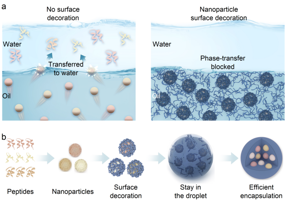 近日,刘东飞教授团队研究发现,将药物分子转化为药物胶体颗粒,可有效规避药物结构及理化性质的多样性,使其仅表现为胶体颗粒的表面性质。本研究通过引入荷电性载体材料,利用分子间相互作用,使胶体颗粒均表现为表面所吸附聚合物性质,进而普适性地实现胶体颗粒的表面修饰。该方法成功将艾塞那肽微球和鲑鱼降钙素微球的包封率从不足5%提升到96%以上,载药量从不足10%提高到46%以上,实现水溶性多肽微球的超高载药。载体材料对多肽纳米粒的高效包封也有望在多种药物微球共载中实现精确的比率控制。本研究成功利用表面修饰实现了鲑鱼降钙素和艾塞那肽两种带相反电荷的多肽在微球中以任意比例高效共包载。此外,吸附的载体材料固化后在多肽纳米粒表面形成聚合物层,实现了鲑鱼降钙素和艾塞那肽微球在3周内的零级释放。由于载体材料用量较少,治疗期间大鼠给药部位未出现明显炎症反应。