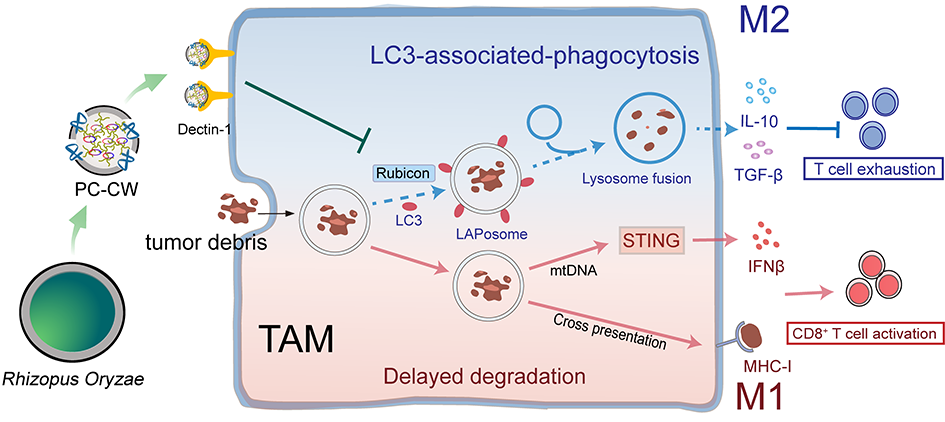 肿瘤免疫治疗是近年来迅速发展的突破性肿瘤疗法,可显著提高患者的生存期。传统细胞毒性疗法产生的凋亡肿瘤细胞具有很强的免疫激活潜力,然而,肿瘤相关巨噬细胞(TAMs)介导的胞葬作用可以通过LC3相关吞噬作用(LAP)负向清除凋亡的肿瘤细胞,抵抗潜在的抗肿瘤免疫反应。同时,LAP作用还可刺激TAMs释放免疫抑制性细胞因子并促进抑制免疫的M2型巨噬细胞转化,进一步加剧肿瘤微环境的免疫抑制。