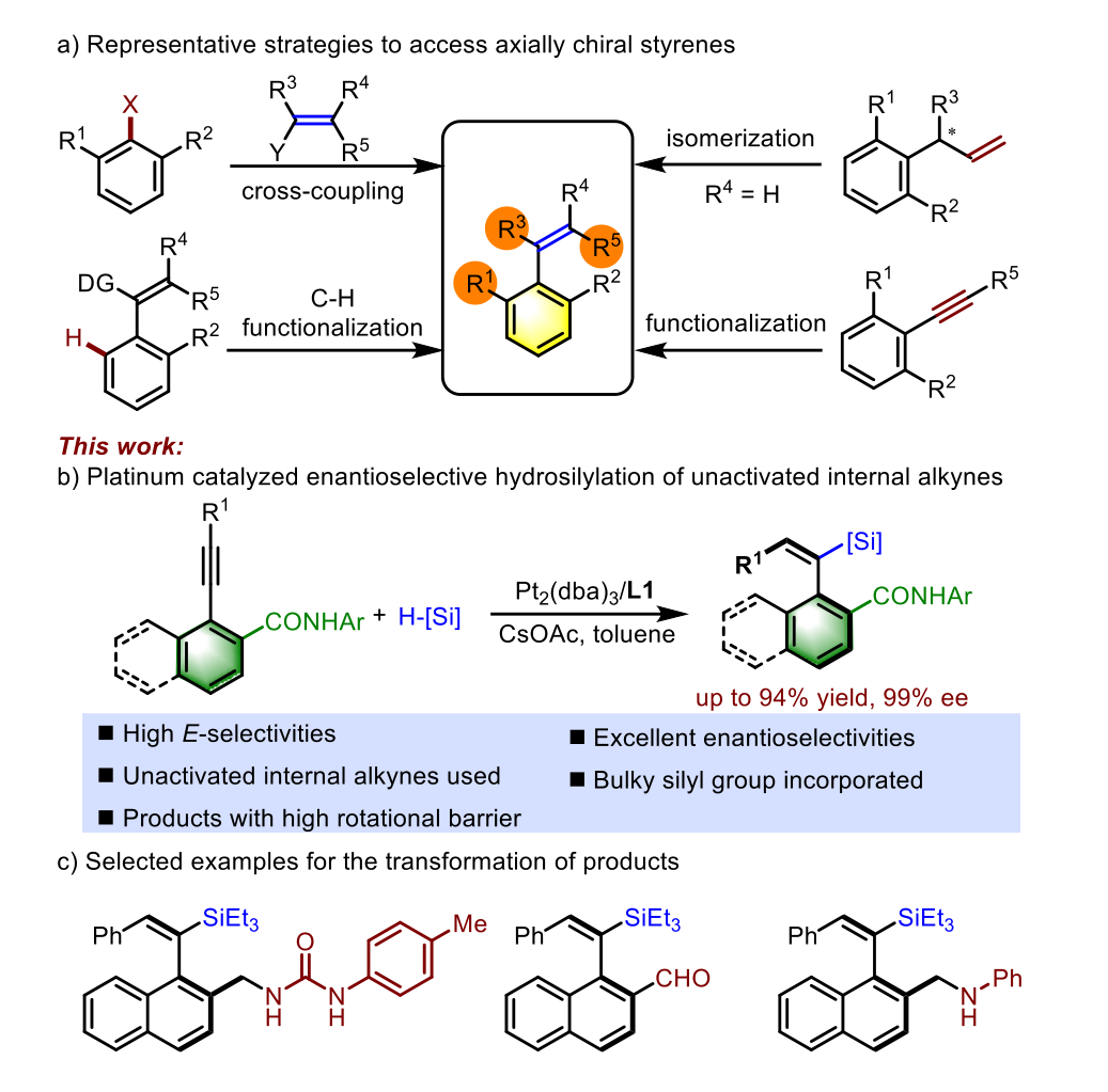 近日,国际著名期刊Angewandte Chemie International Edition(IF:16.823)在线发表了beat365药学院姚和权/高尚团队题为“Atroposelective Synthesis of Axially Chiral Styrenes by Platinum-Catalyzed Stereoselective Hydrosilylation of Internal Alkynes”最新科研成果。药学院2022级博士研究生吴启民为本论文的第一作者,姚和权教授和高尚特聘副研究员为本文的共同通讯作者,beat365官方网站为本文的唯一通讯单位。