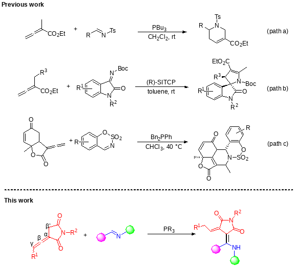 膦催化反应在构建碳-碳/碳-杂原子键中已得到蓬勃发展,其中亲核有机膦催化联烯与亚胺的环化及环加成反应已经逐渐发展成为构建碳环和杂环化合物以及天然产物的重要工具之一。衣康酰胺是多种天然产物、生物活性分子和光学材料中的骨架结构。周庆发课题组通过发展膦催化的非环化反应,在温和的条件下实现了衣康酰胺衍生物的高效、高立体选择性构建。该反应不同于联烯与亚胺的经典环化反应模式,反应经历了两性离子中间体与芳基亚胺的非环化反应模式,作者对反应机理进行了深入研究,通过一系列控制实验并结合DFT理论计算表明碳酸在该反应模式中起关键作用。